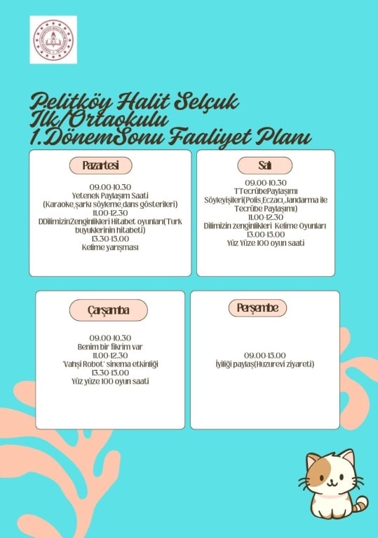 Bakanlık tarafından her tür ve kademedeki tüm okullara gönderilen resmi yazı ile Bakanlıkça hazırlanan "Dönem Sonu Faaliyet Haftası Planı 2024 - 2025" örneği üzerinden, "Dönem Sonu Faaliyet Haftası Uygulama Kılavuzu Ocak 2025" dâhilinde birinci dönem son haftasının öğrencilerin ilgisini çekecek ve coşkuyla geçirilecek bir hafta olarak tasarlanması amaçlanmıştır.